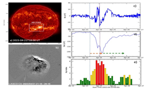 At midnight (Indian Time – IST) on April 21, 2023, a massive CME burst erupted from 'active region 13283' located near the solar disk center, resulting in the most intense geomagnetic storm of Solar Cycle 25. This CME was launched at a high speed of about 1500 km/second and on April 23 at 12:30 pm Indian time, it encountered the near-Earth atmosphere. As a result, a geomagnetic storm began on Earth just an hour later. The storm reached its peak magnetic field and was classified as “G4 Severe”. The resulting aurora was captured by all-sky cameras located at the Indian Astronomical Observatory in Hanle, Ladakh, which is operated by the Indian Institute of Astrophysics.